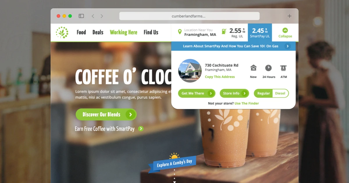 The new experience replaced a static site with a living brand touchpoint—streamlined, mobile-first, and true to Cumberland Farms’ everyday ease.
